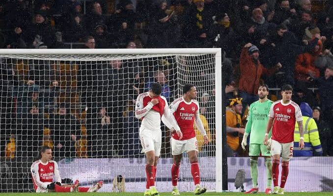 Arsenal were held to a dramatic 2–2 draw by bottom club Wolves at Molineux on Wednesday surrendering a two-goal advantage in stoppage time to see the Premier League leaders slip valuable points in their title bid.