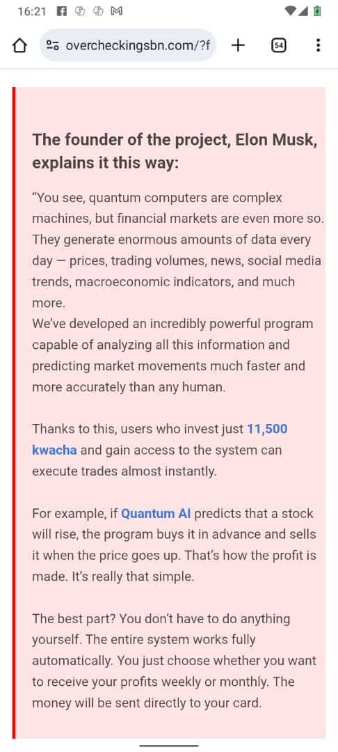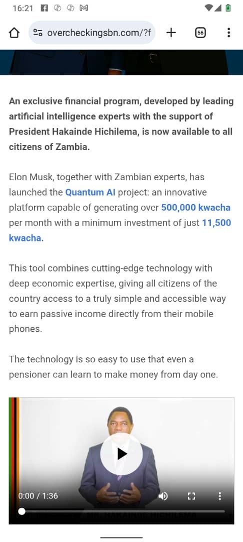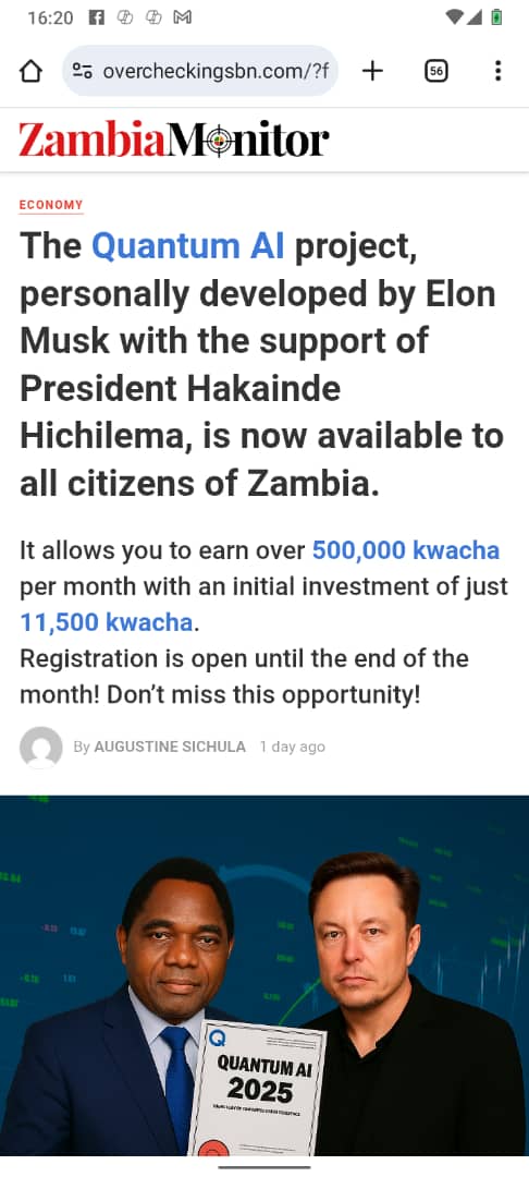 “The Quantum AI project, personally developed by Elon Musk with the support of President Hakainde Hichilema, is now available to all citizens of Zambia.”
