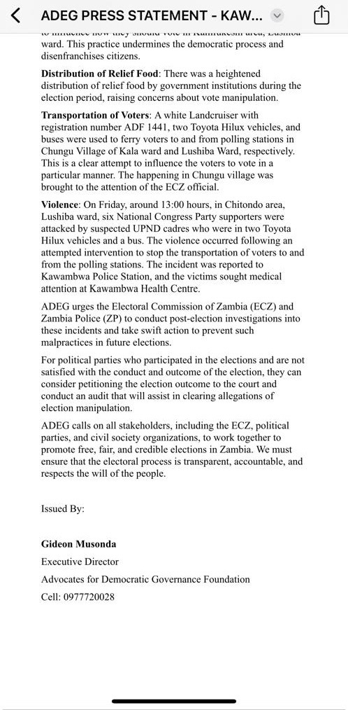 Musonda called on the ECZ and Zambia Police to conduct a thorough post-election investigation into these allegations and take swift action to prevent future electoral malpractices.