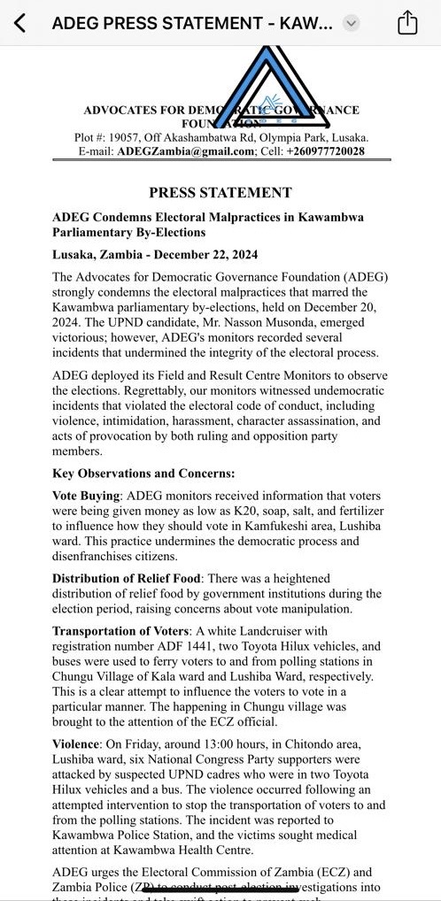 The Advocates for Democratic Governance Foundation (ADEG) has condemned the alleged electoral malpractices reported during the Kawambwa parliamentary by-elections held on December 20, 2024.