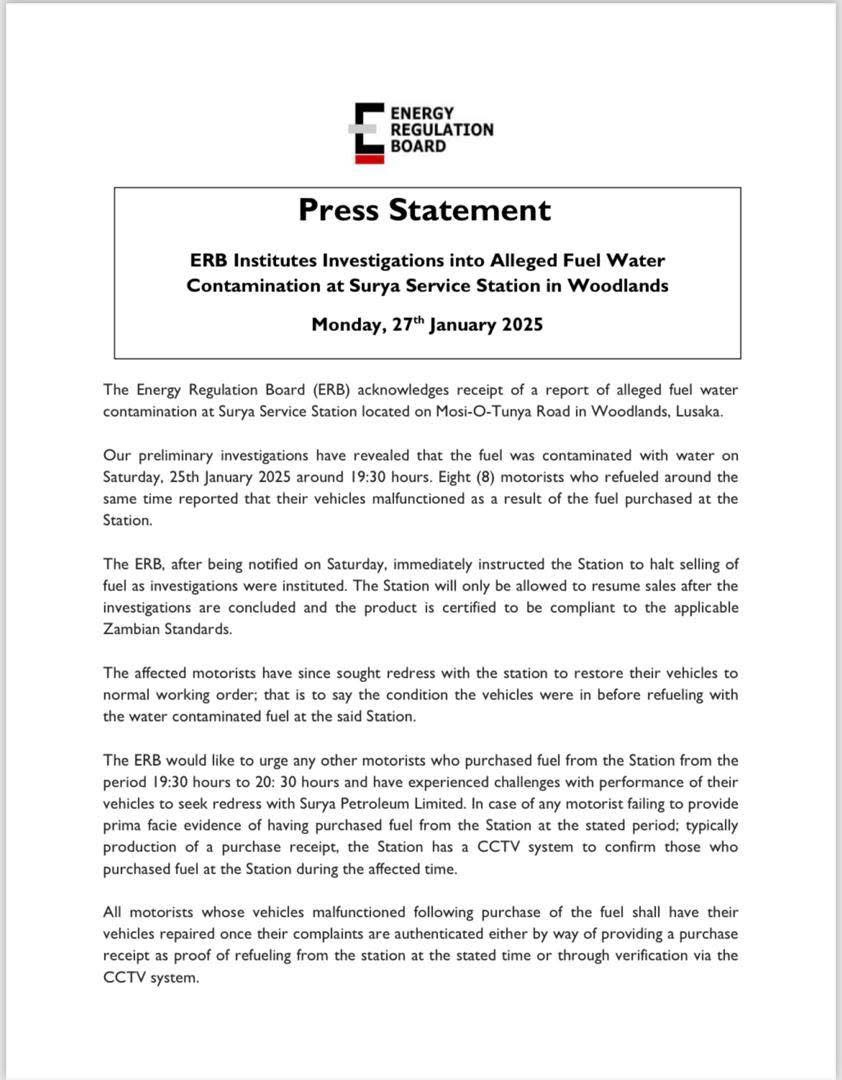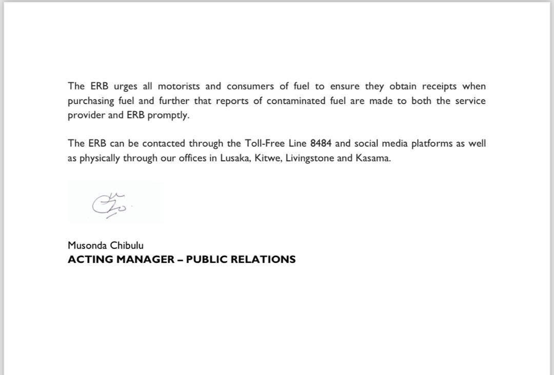ERB Acting Public Relations Manager, Musonda Chibulu, confirmed the development, stating: “The affected motorists have already sought compensation to repair their vehicles. We urge other motorists who purchased fuel from the station between 19:30 and 20:30 hours and experienced vehicle problems to come forward and seek redress.”