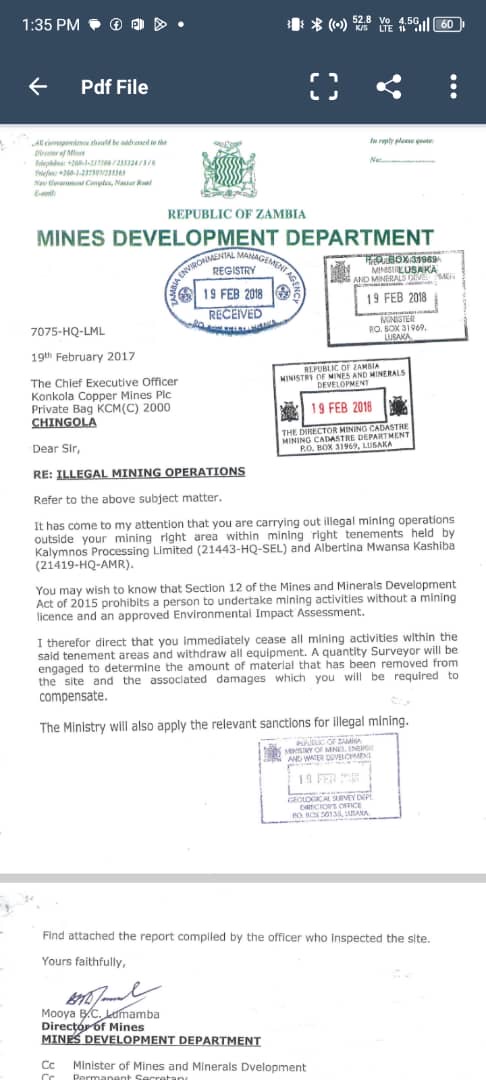 In a letter submitted to the Ministry of Mines and Minerals Development, the two license holders have urged Minister Paul Kabuswe, to take decisive action to enforce the Ministry’s own findings and directives—some of which date back as far as 2017.