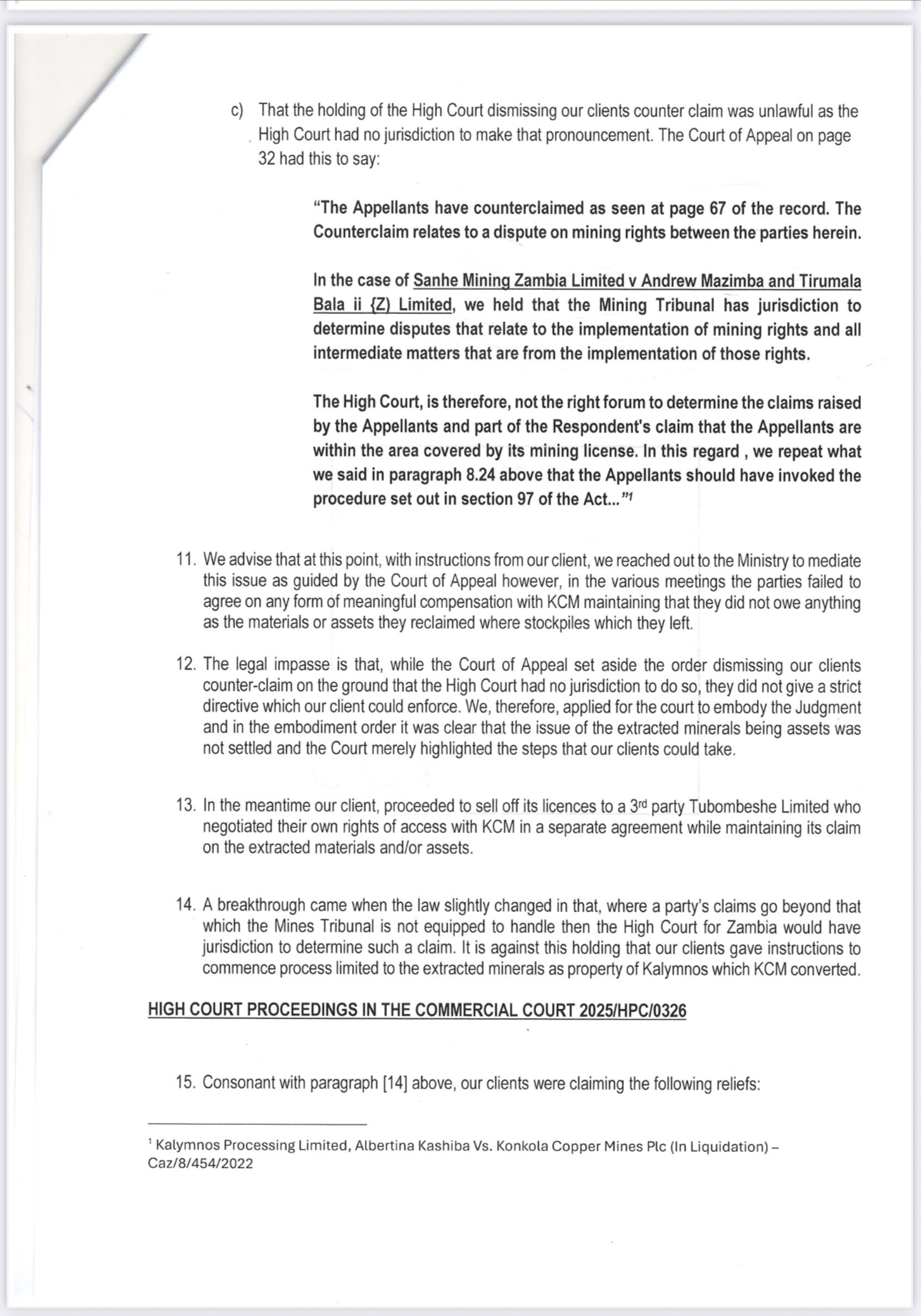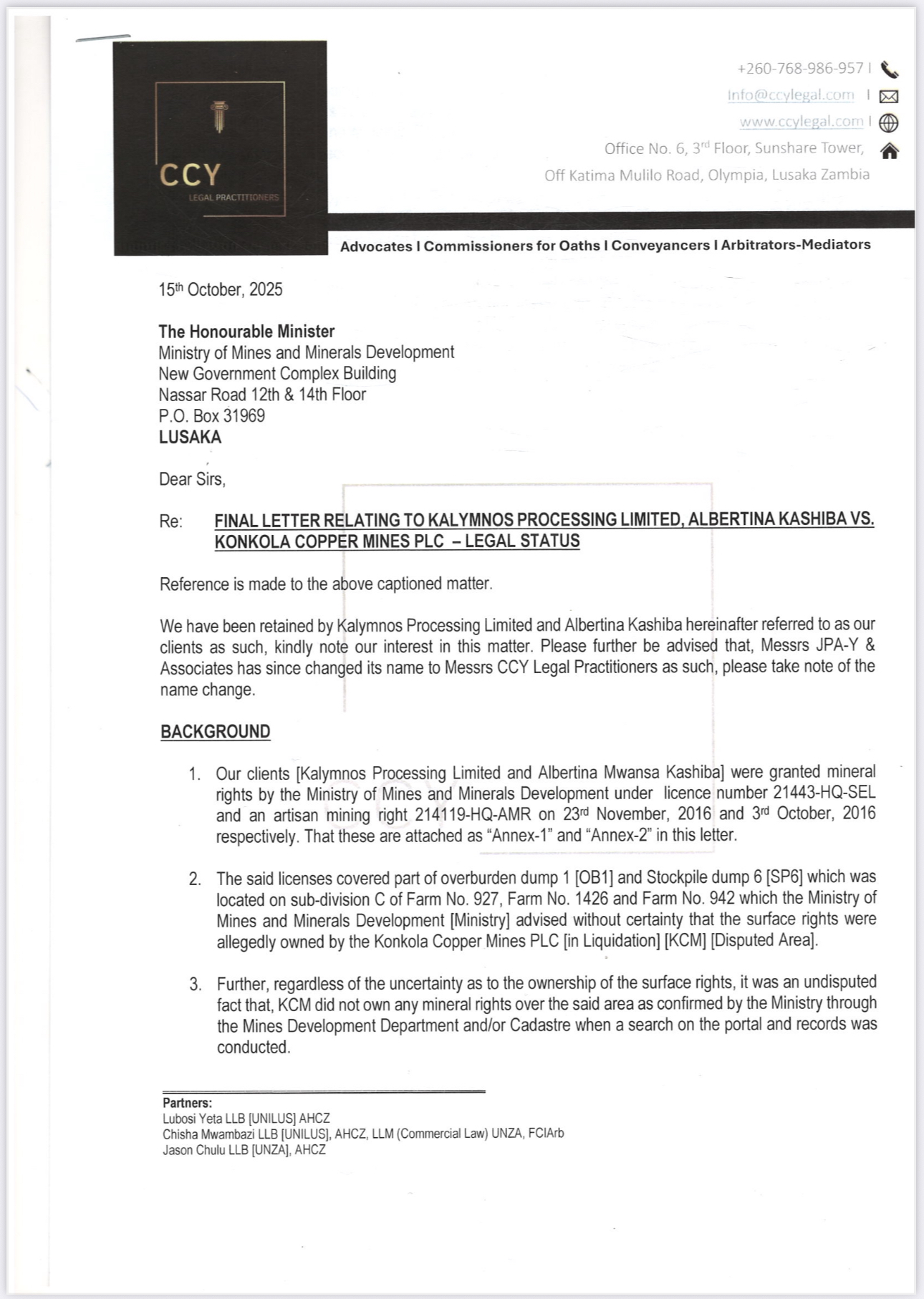 The demand follows years of unresolved disputes concerning mineral rights and purported persistent encroachment by KCM into two tenement areas said to be legally held by Kalymnos and Albertina Kashiba since 2016.