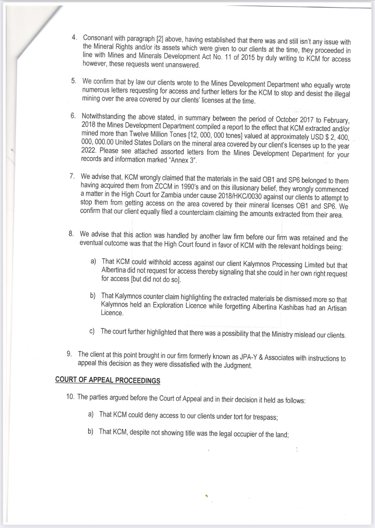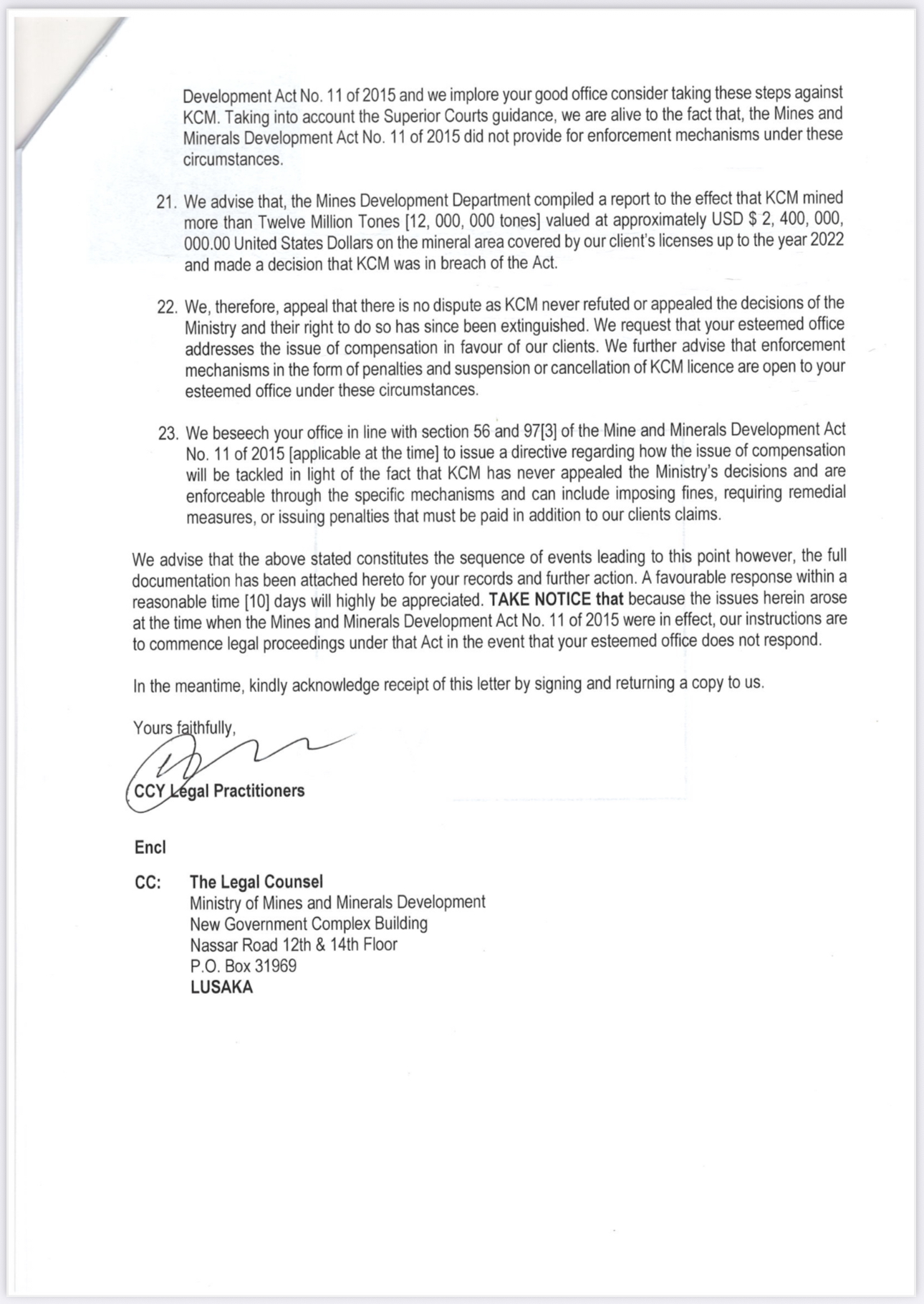 “The Ministry’s own internal reports concluded that KCM breached the Mines and Minerals Development Act,” the letter states. “There is no ongoing legal dispute on this matter, as the decisions of the Ministry were never contested by KCM and thus stand uncontested in law,” it claimed.